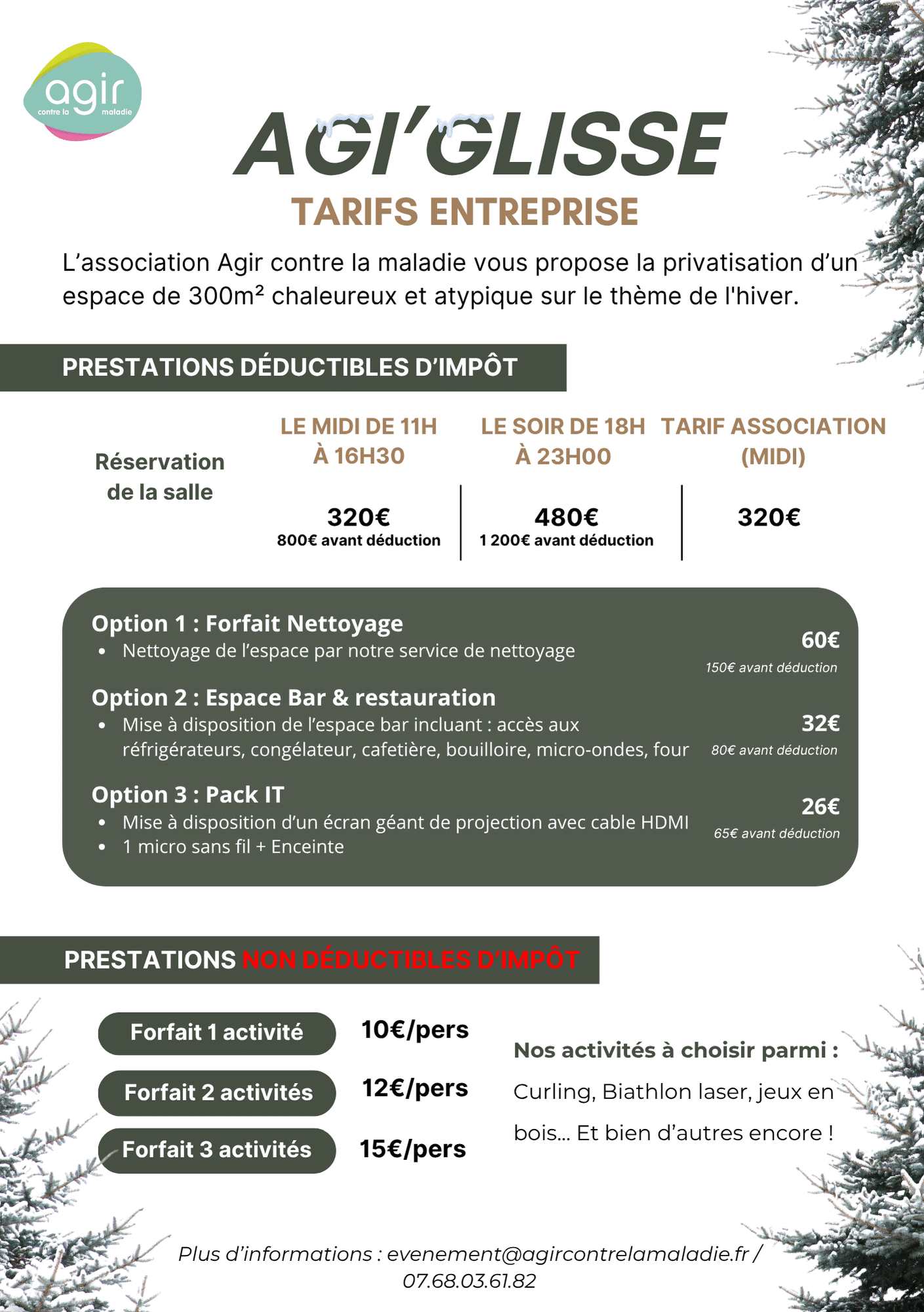 Chaque réservation contribue à notre association. Réservation possible de décembre à février 2025. N’hésitez pas à nous contacter par email sur : evenement@agircontrelamaladie.fr ou par téléphone au 07 68 03 61 82